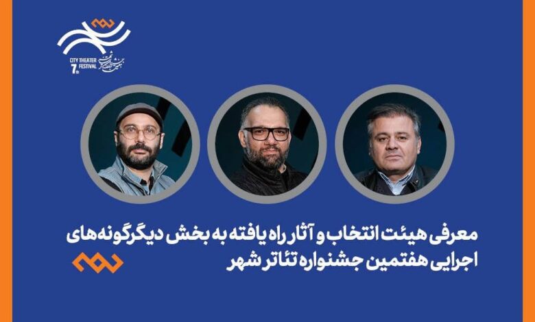 به گزارش خبرگزاری خبرآنلاین به نقل از روابط عمومی جشنواره تئاتر «شهر»، هیئت انتخاب آثار بخش دیگرگونههای اجرایی در این دوره متشکل از فاتح بادپروا، میلاد مولوی و محمدهادی عطایی ۱۲ اثر را به شرح زیر و بدون اولویت به دبیرخانه هفتمین جشنواره تئاتر «شهر» معرفی کردند: